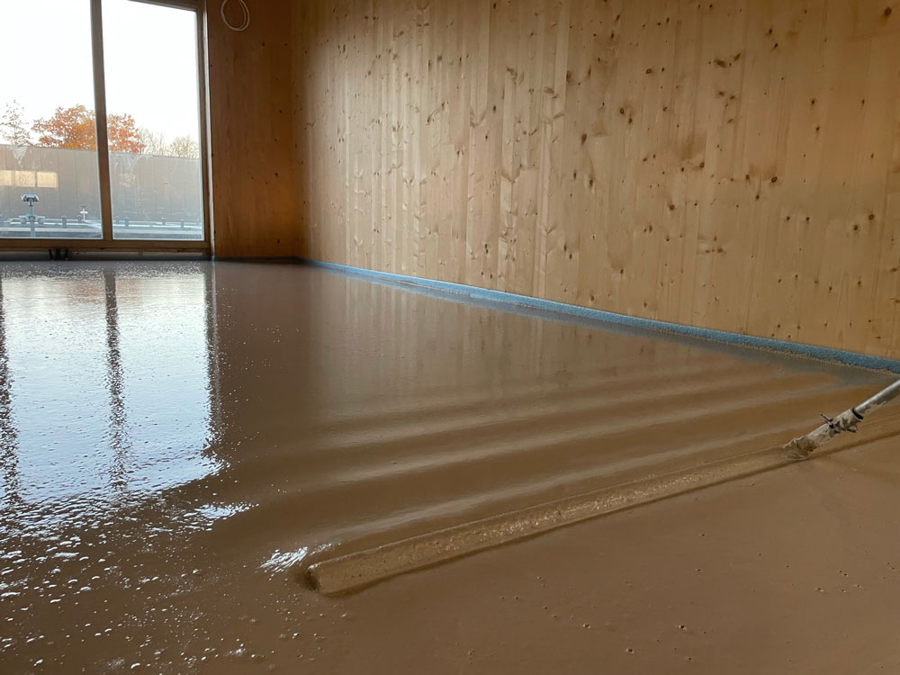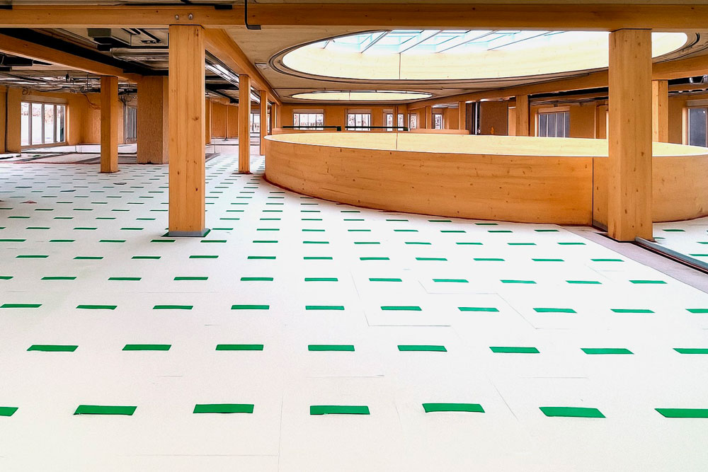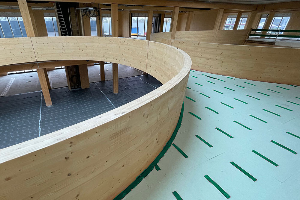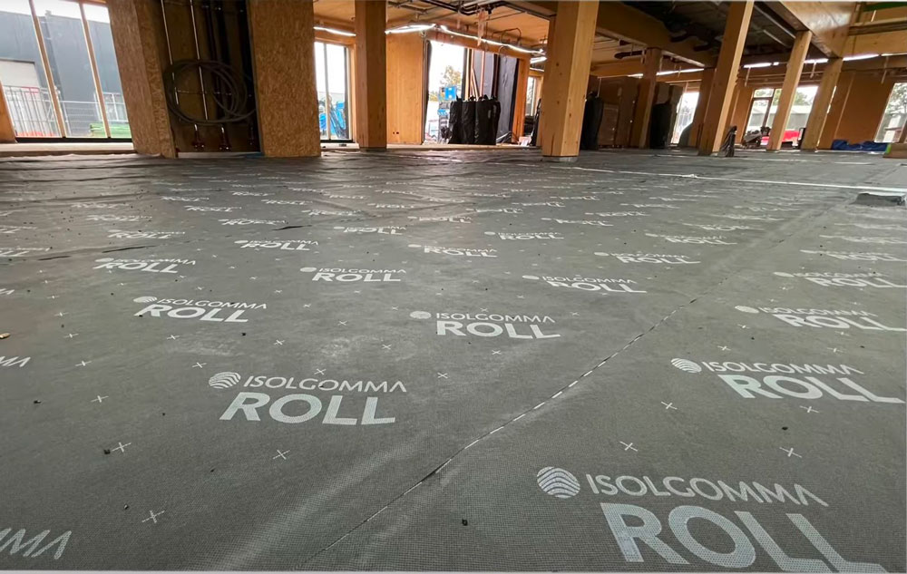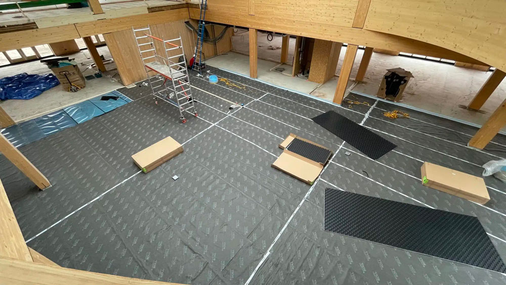 Per garantire il comfort acustico necessario, il nostro partner ISMT B.V. ha proposto l’utilizzo del sistema HIGHMAT 20 , composto da due appoggi in gomma inseriti in un materassino di fibra di poliestere. Questo sistema acustico è stato inserito in una stratigrafia costituita da un massetto in anidrite e una pellicola in PE, posati sopra i solai in CLT. La soluzione è stata scelta per la sua efficacia nella riduzione del rumore da impatto, la facilità di posa e la compatibilità con strutture leggere come quelle in legno. Inoltre, per il piano terra è stato scelto il prodotto linea ROLL in combinazione con il riscaldamento a pavimento per ridurre i rumori da calpestio in orizzontale.