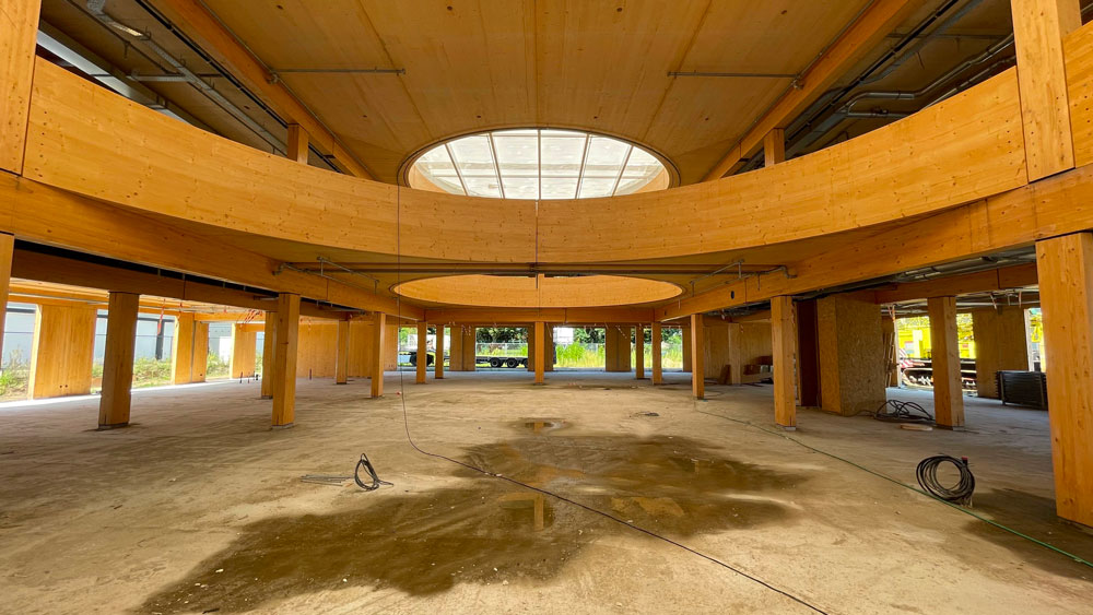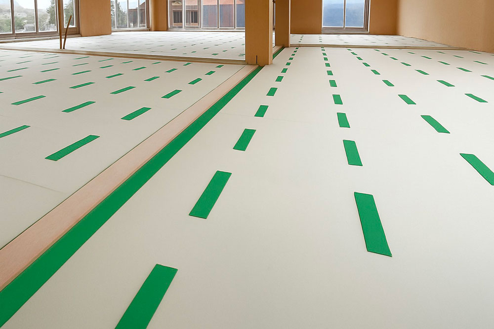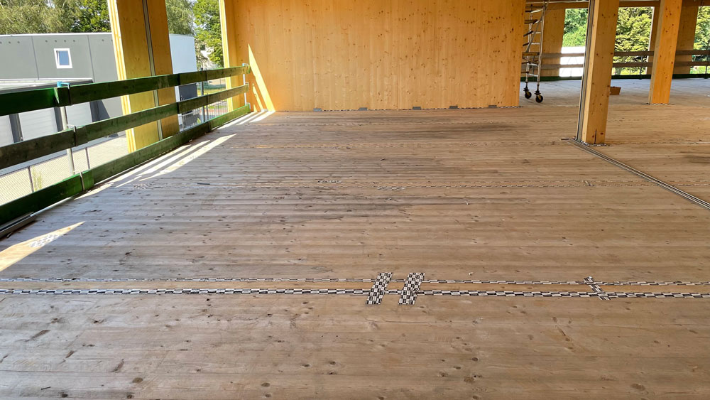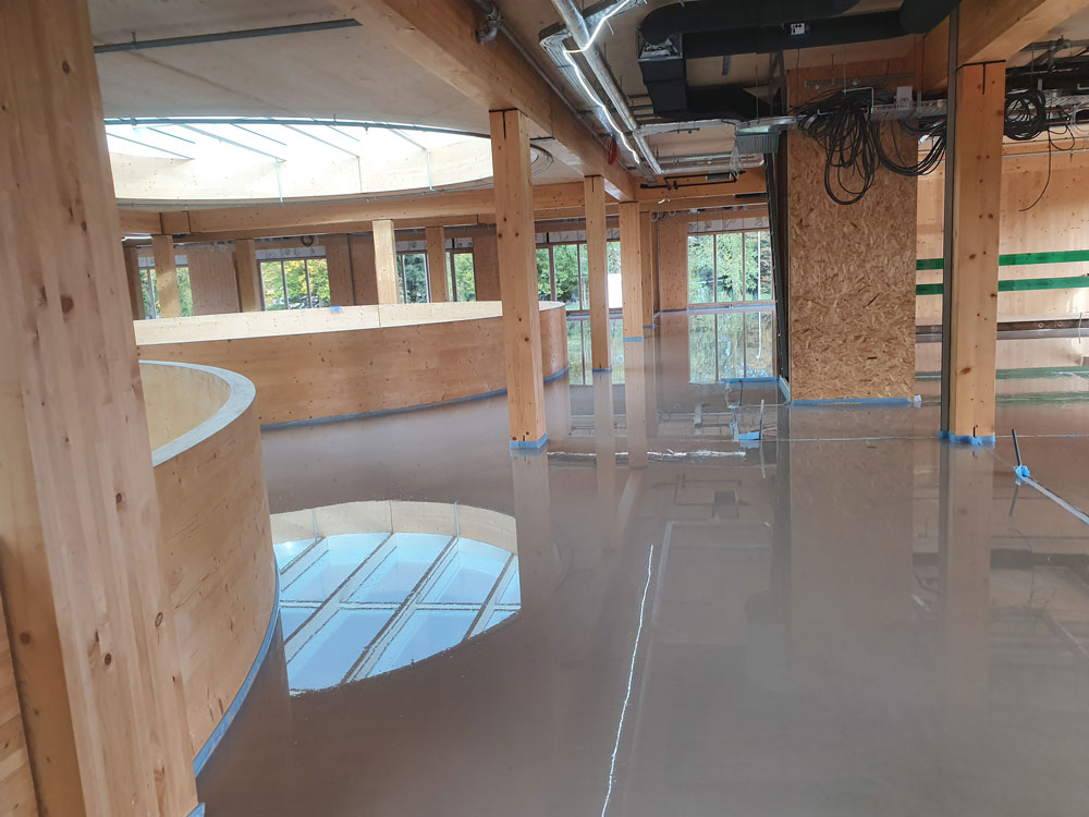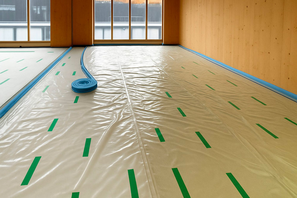 Per garantire il comfort acustico necessario, il nostro partner ISMT B.V. ha proposto l’utilizzo del sistema HIGHMAT 20 , composto da due appoggi in gomma inseriti in un materassino di fibra di poliestere. Questo sistema acustico è stato inserito in una stratigrafia costituita da un massetto in anidrite e una pellicola in PE, posati sopra i solai in CLT. La soluzione è stata scelta per la sua efficacia nella riduzione del rumore da impatto, la facilità di posa e la compatibilità con strutture leggere come quelle in legno. Inoltre, per il piano terra è stato scelto il prodotto linea ROLL in combinazione con il riscaldamento a pavimento per ridurre i rumori da calpestio in orizzontale.